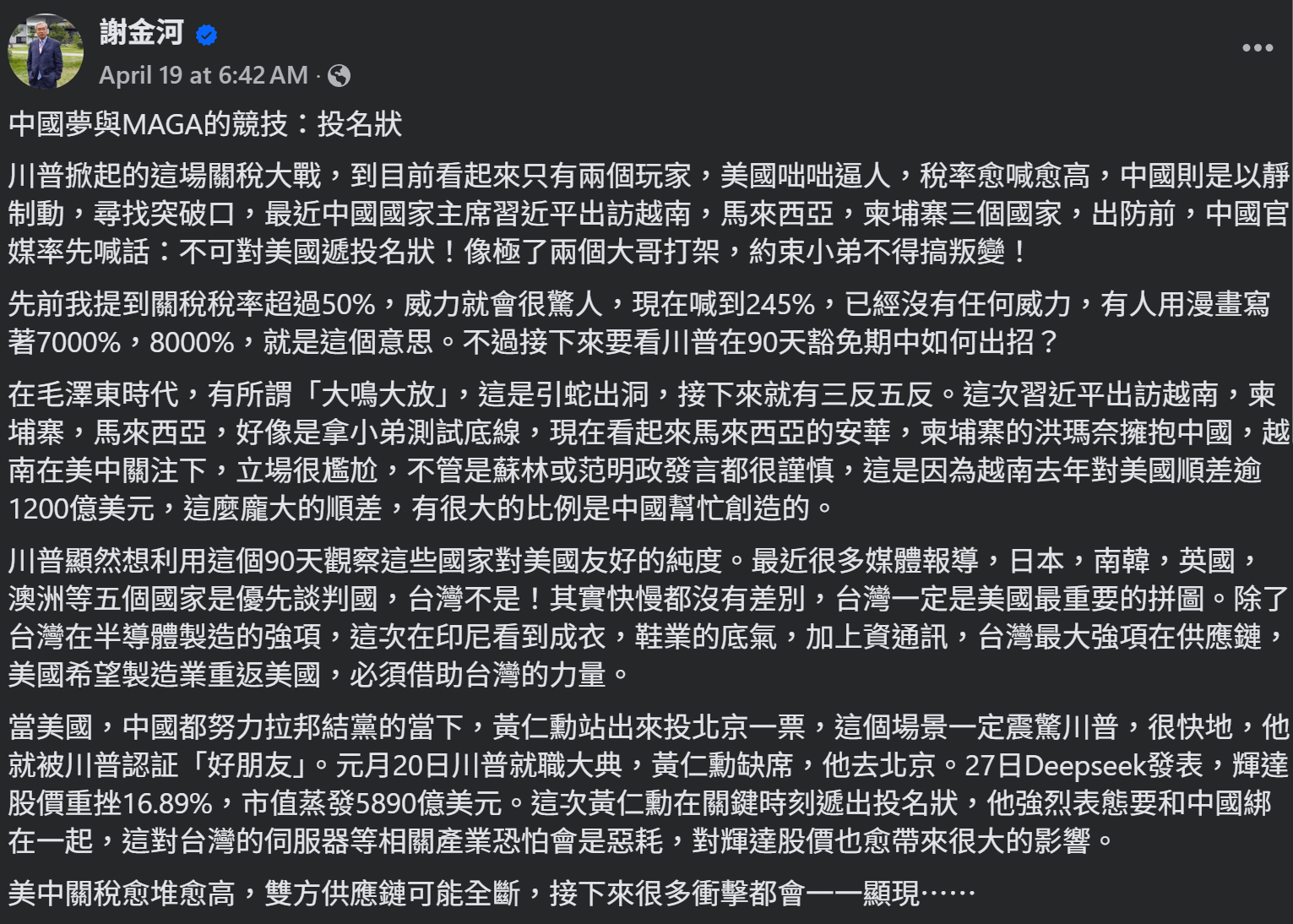 財信傳媒董事長謝金河在社群媒體上指出,「當美國、大陸都努力拉邦結派的當下,黃仁勳站出來投北京一票,這個場景一定震驚川普,很快地,他就被川普認證『好朋友』」。謝金河進一步評論說,「這次黃仁勳在關鍵時刻遞出投名狀,強烈表態要和大陸綁在一起,這對台灣伺服器等相關產業恐怕是惡耗」。